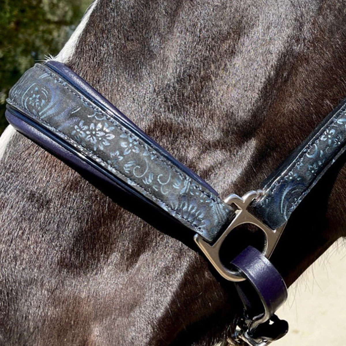 These gorgeously styled bridles are all around amazing because they are designed with your horse’s comfort in mind, this gorgeous navy leather halter matches the Munich snaffle bridle.