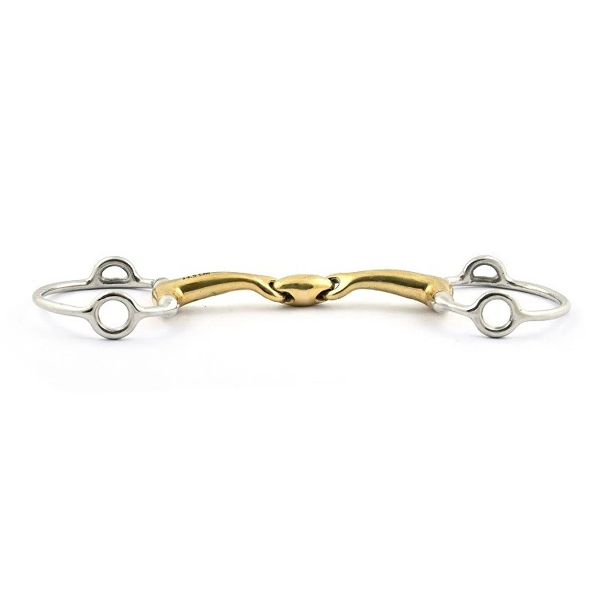 This bit needs special cheek pieces and can be used directly with two reins, with bit loops or with four reins. The curved cannon makes the contact area larger so the horse can easily take the bit.