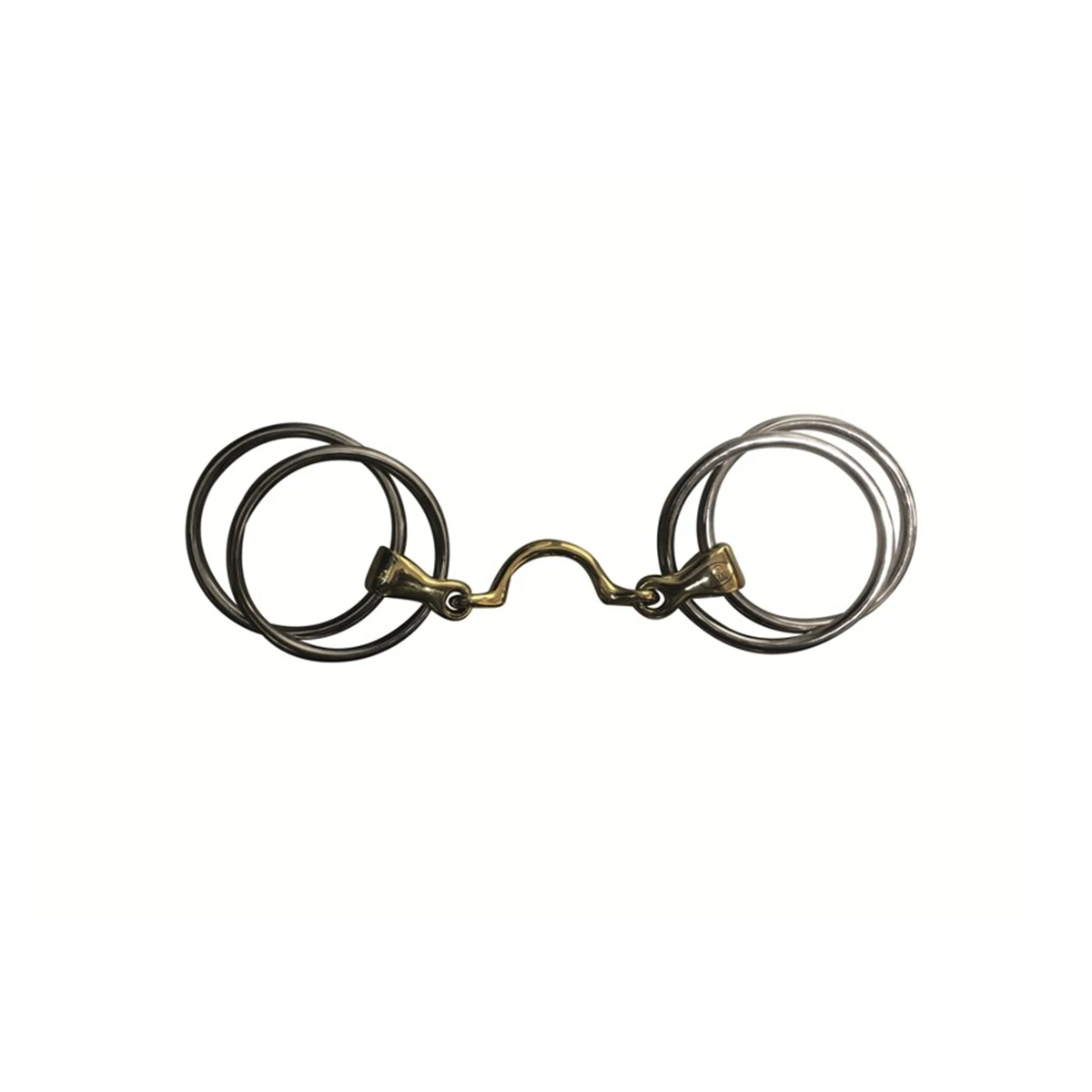 Featuring 70mm rings, 17 mm mouthpiece, and composed of a German Silver Alloy, this bit is unique in the fact that breaks up the pressure points on the horse. Comprised with 4 rings, the “loose” inner rings are attached the the cheekpieces and the outer rings are connected to the reins. The bit squeezes the cheeks as opposed to pulling on the bars of the mouth.