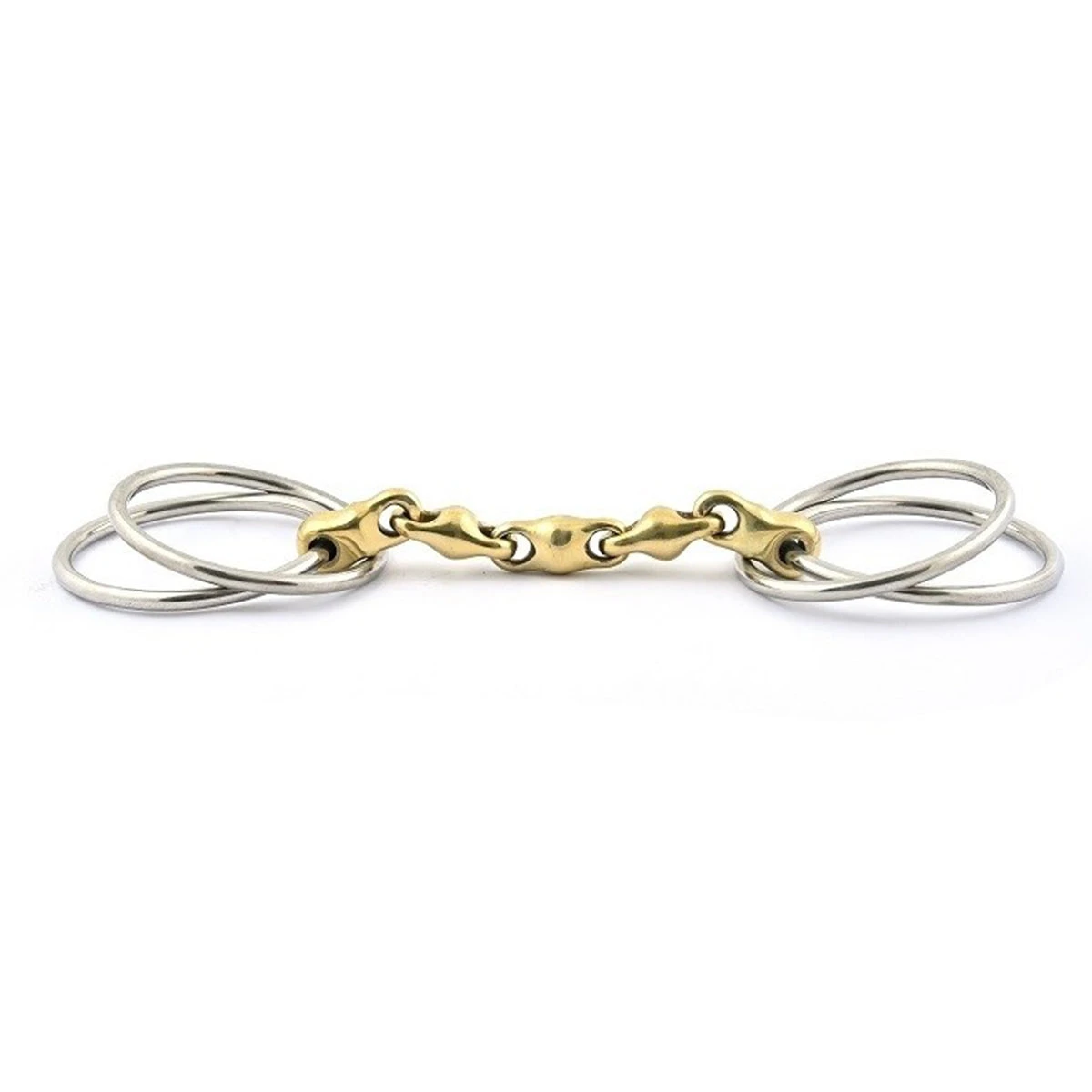 Featuring 70mm rings, 17 mm mouthpiece, and composed of a German Silver, a relaxing and solid alloy. This bit is unique in the fact that breaks up the pressure points on the horse. Comprised with 4 rings, the “loose” inner rings are attached the the cheekpieces and the outer rings are connected to the reins. The bit squeezes the cheeks as opposed to pulling on the bars of the mouth.