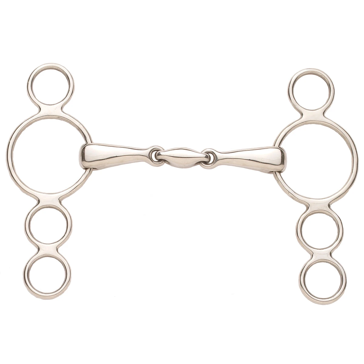 This bit is for experienced hands as the gag incorporates leverage with the standard snaffle action and adds pressure on the poll. This bit is used to elevate the horse’s head.