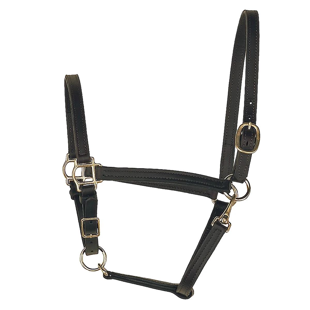 This halter is often the choice for horses with a fine head. 3/4″ width, one buckle crown and snap at throat.