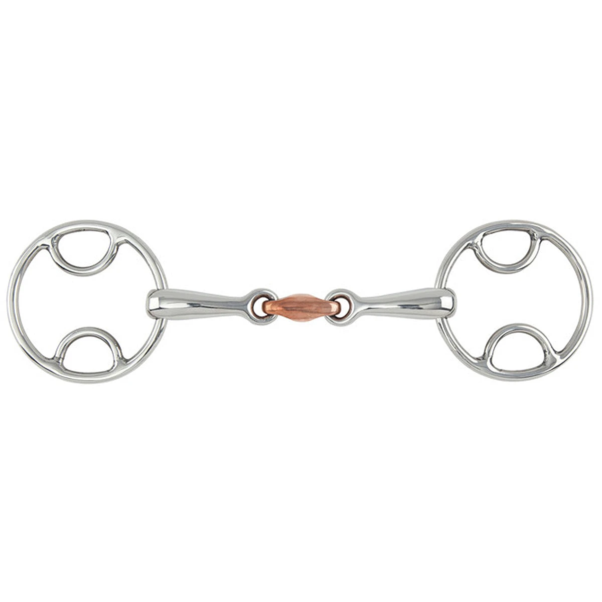 With a stainless steel mouthpiece, this bit is durable, easy to clean, tasteless, and does not rust. The addition of a copper link creates warmth and encourages salivation for a soft mouth. The rings allow for mild leverage with rein placement.